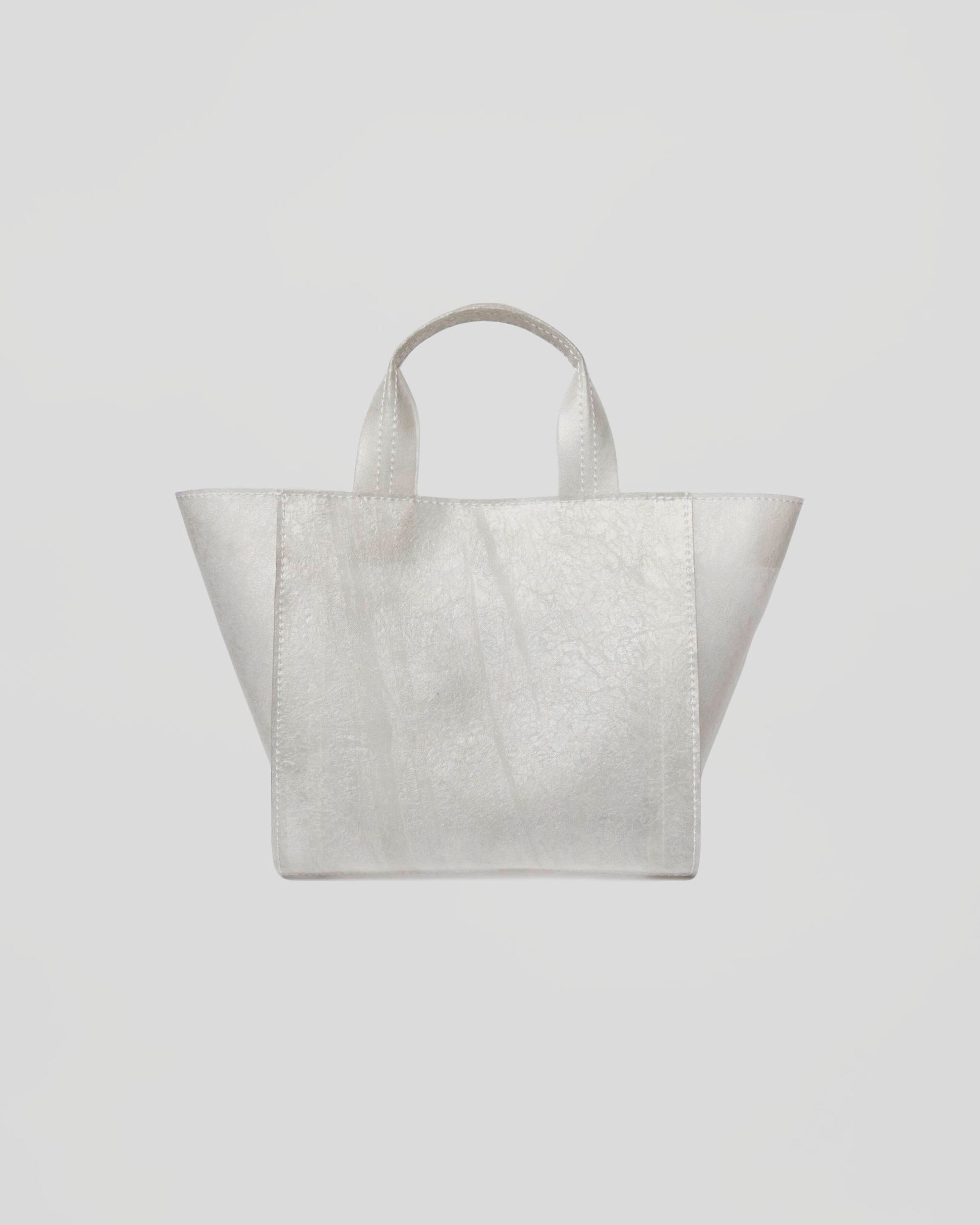透明のビニール傘を再利用した素材で作られたミニマルでコンパクトなトートバッグ。