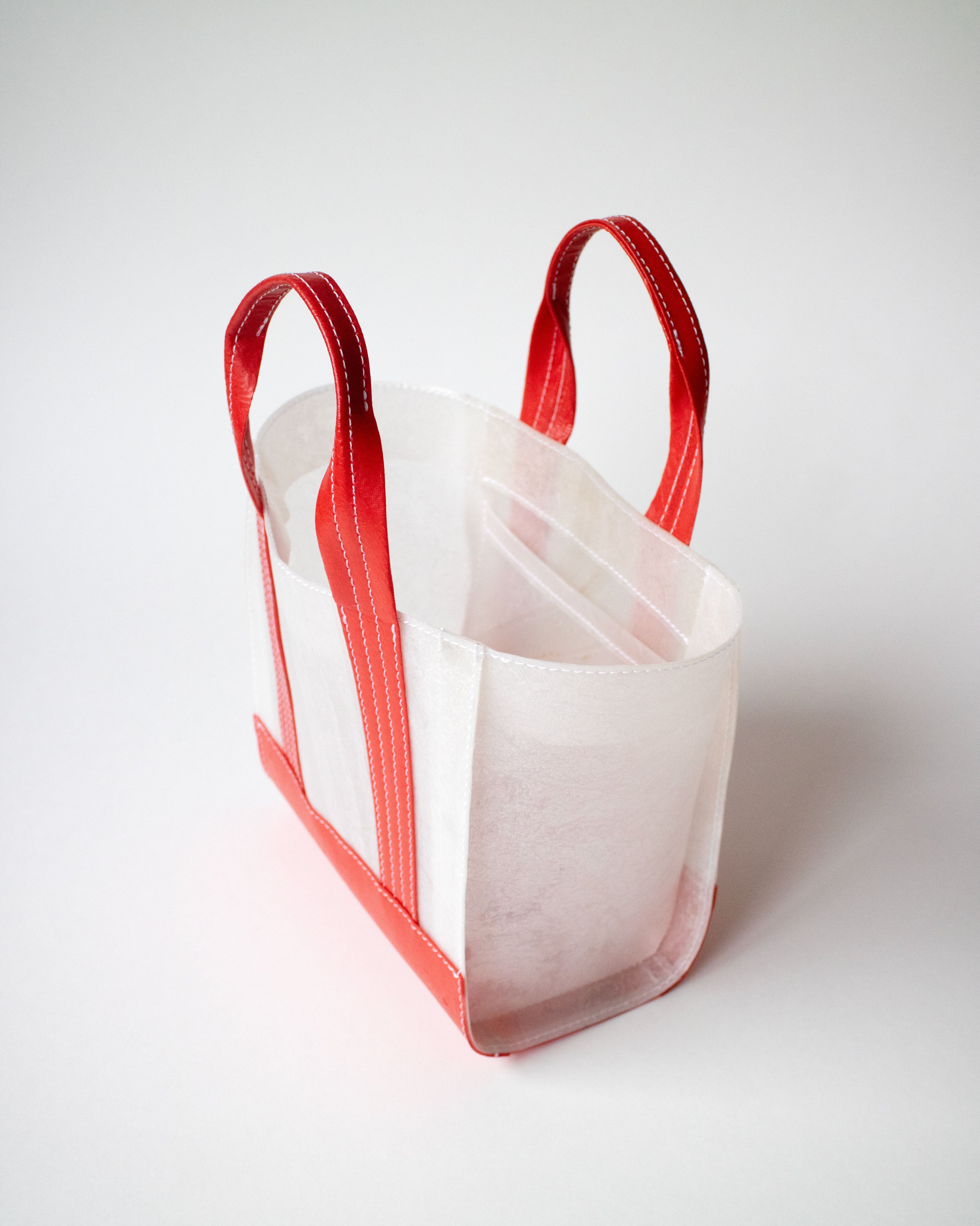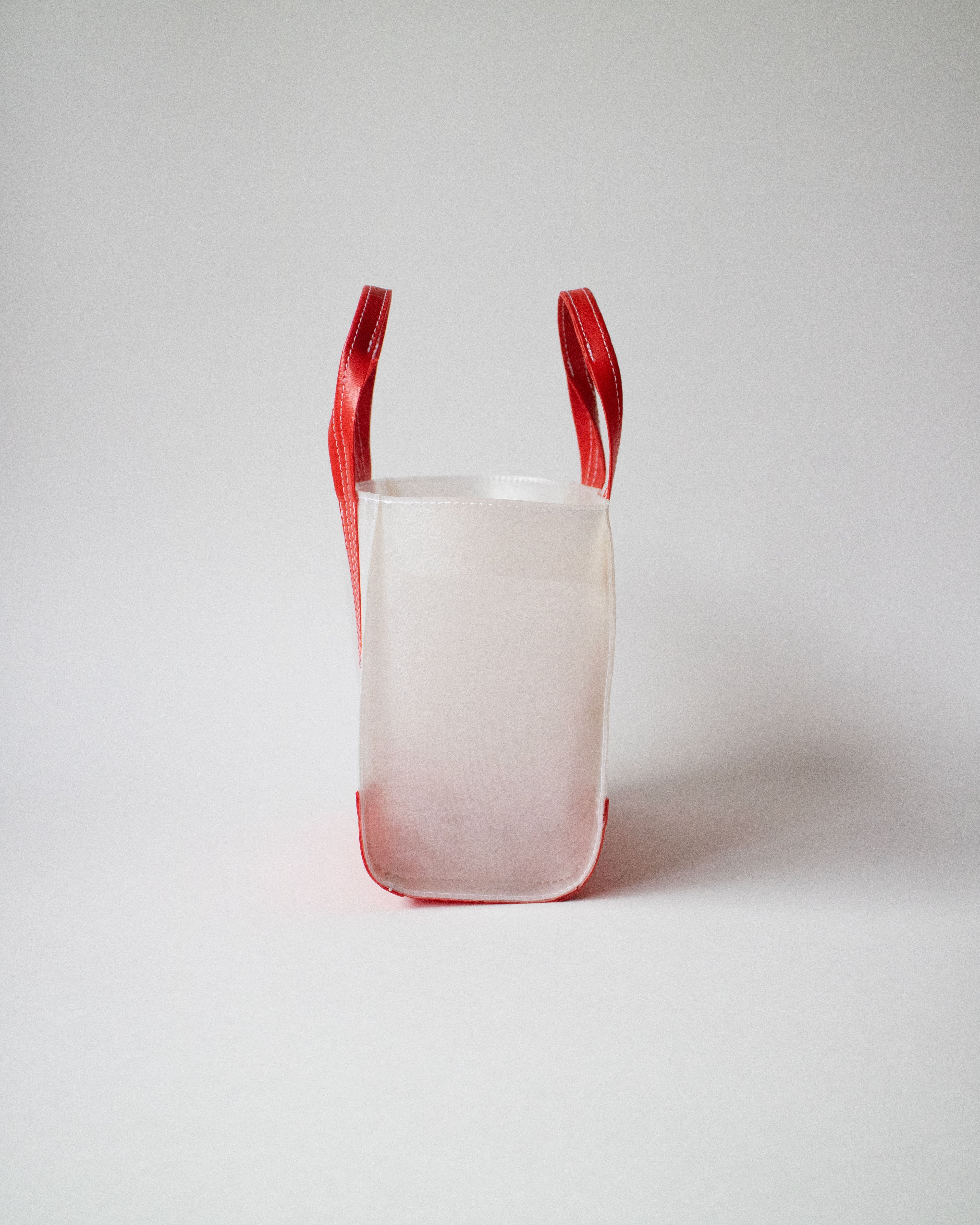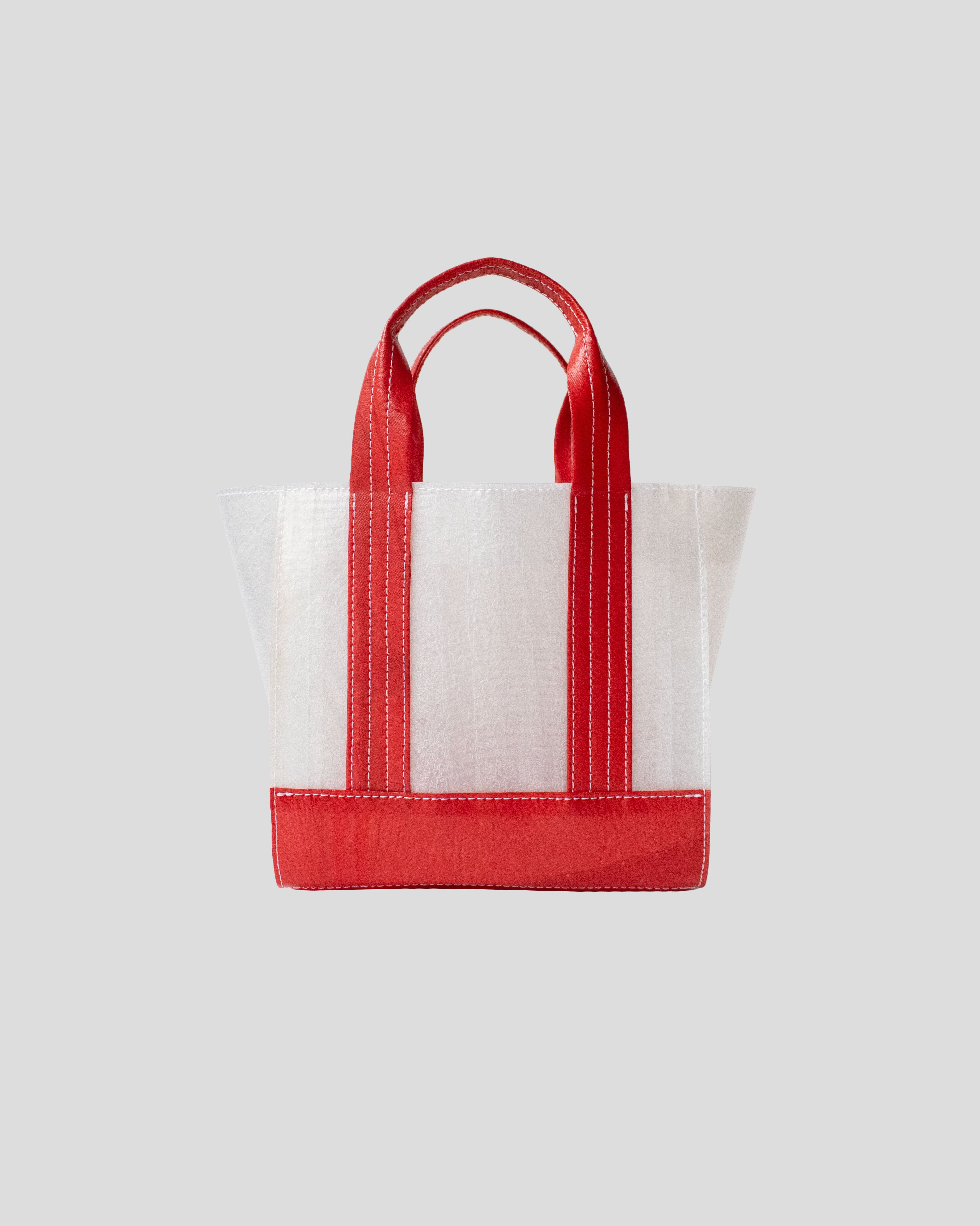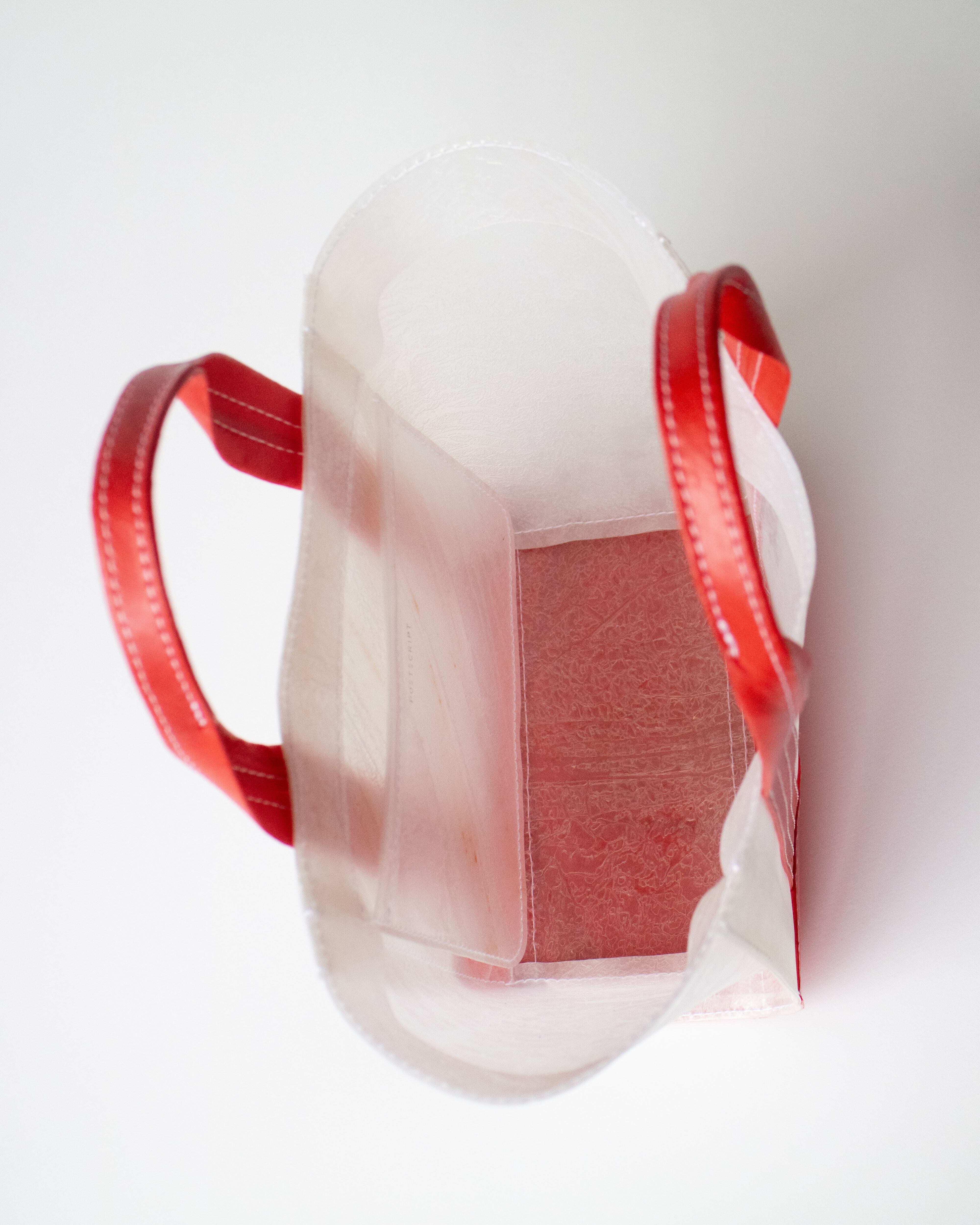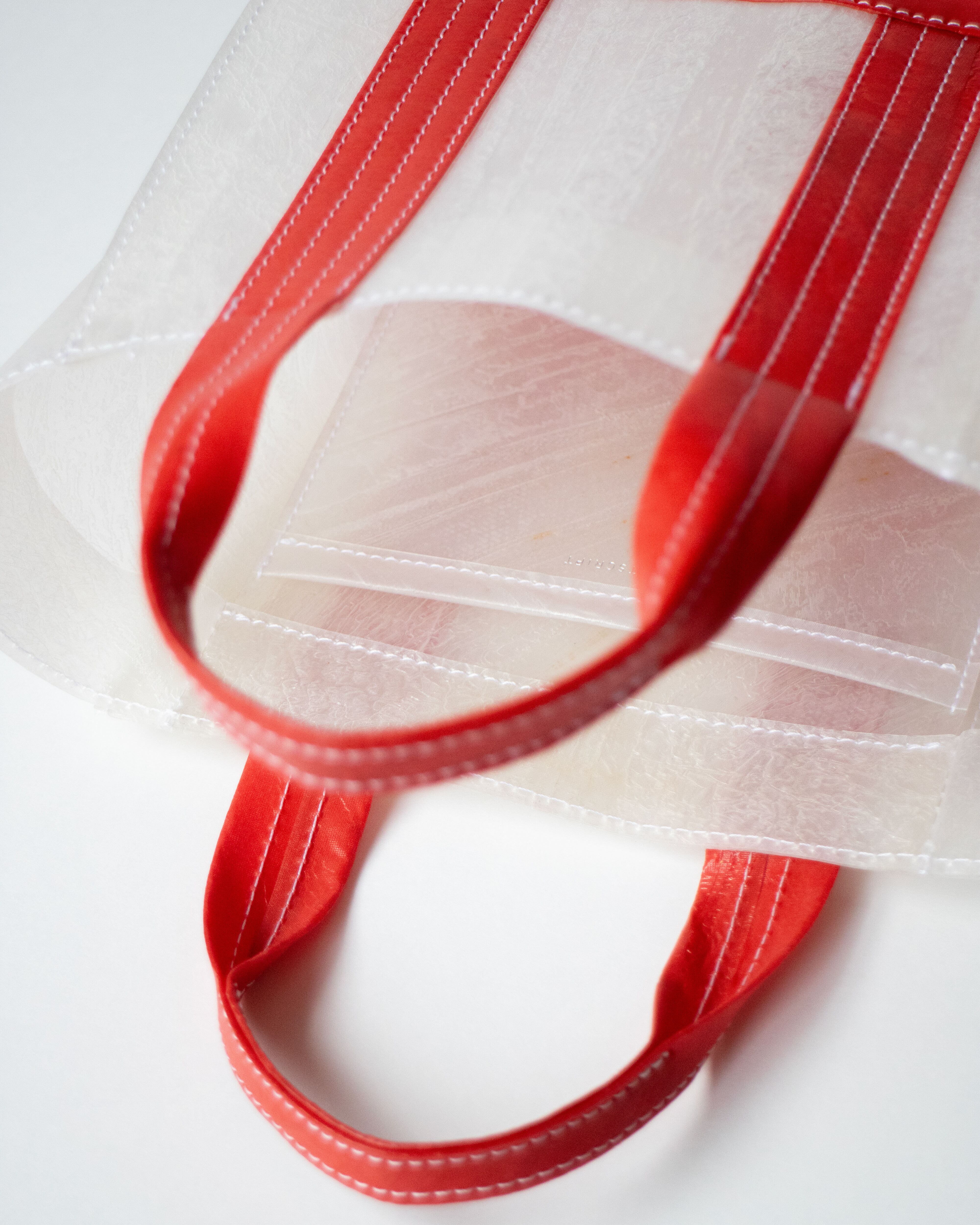 透明のビニール傘を再利用した素材で作られたミニマルでコンパクトなトートバッグ。