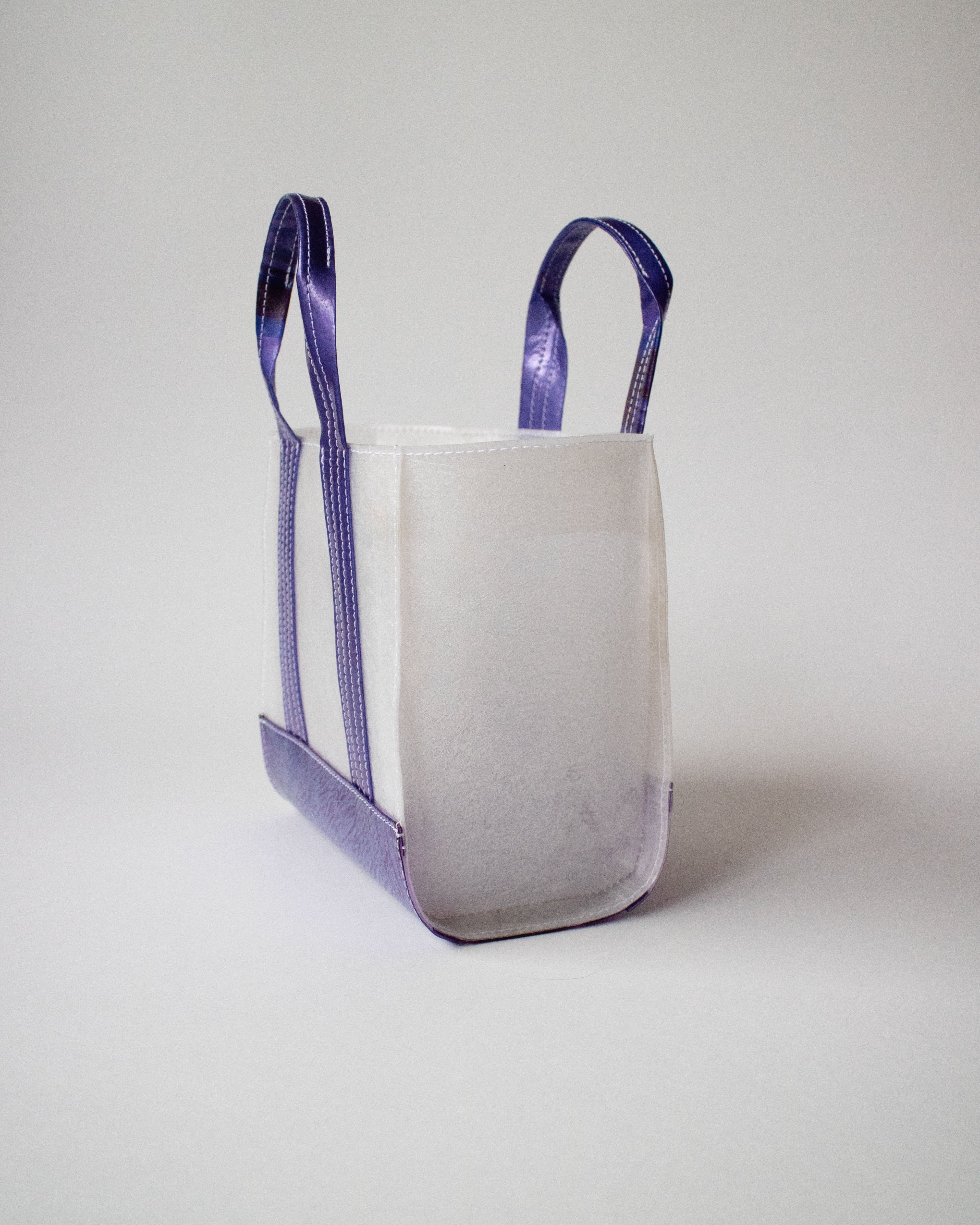 透明のビニール傘を再利用した素材で作られたミニマルでコンパクトなトートバッグ。